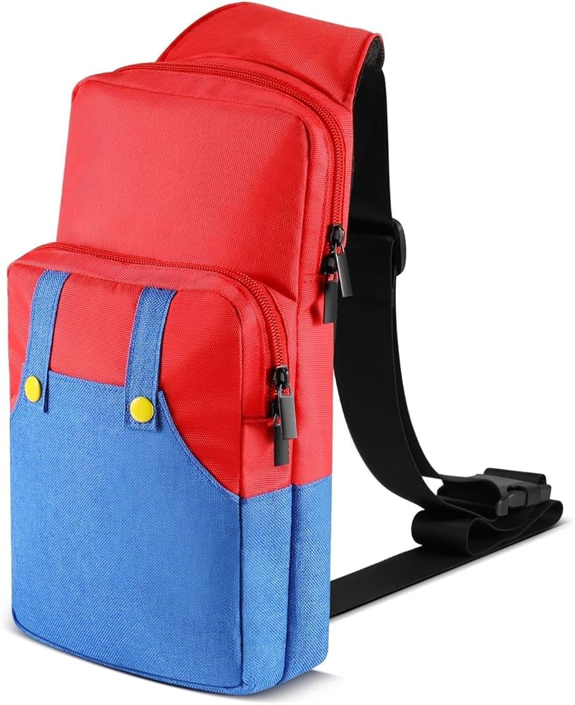 Bolsa estilo transpassada oficial para Nintendo Switch, decorada com tema de Mario; compartimentos acolchoados para console, controles, jogos e acessórios.